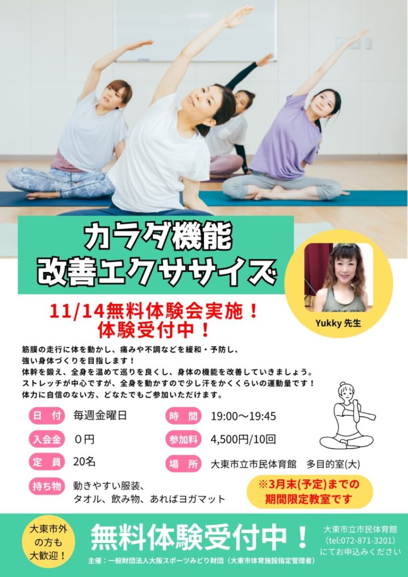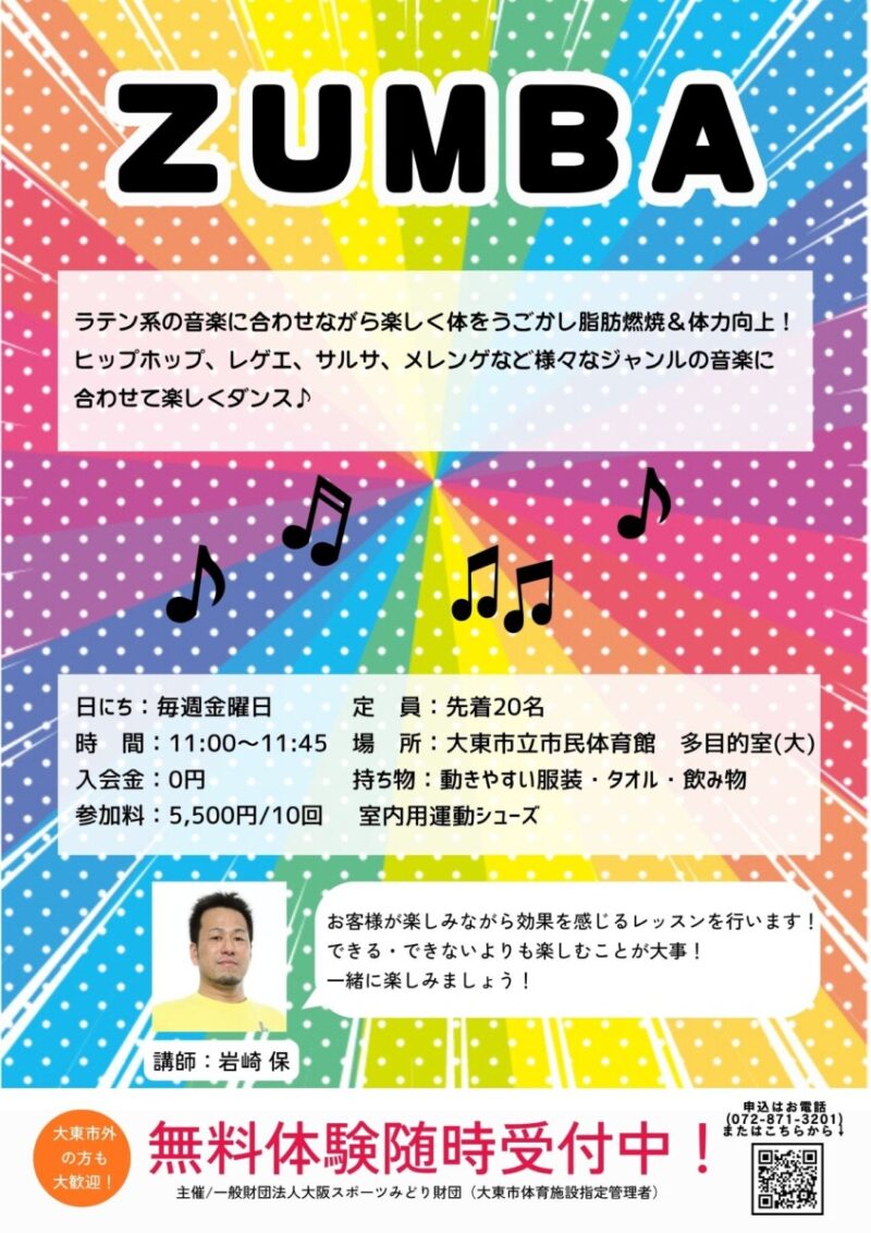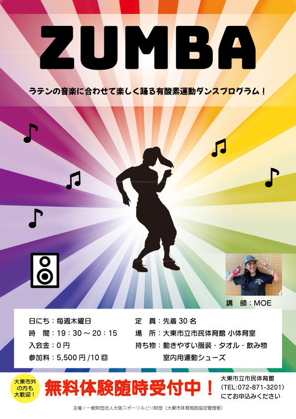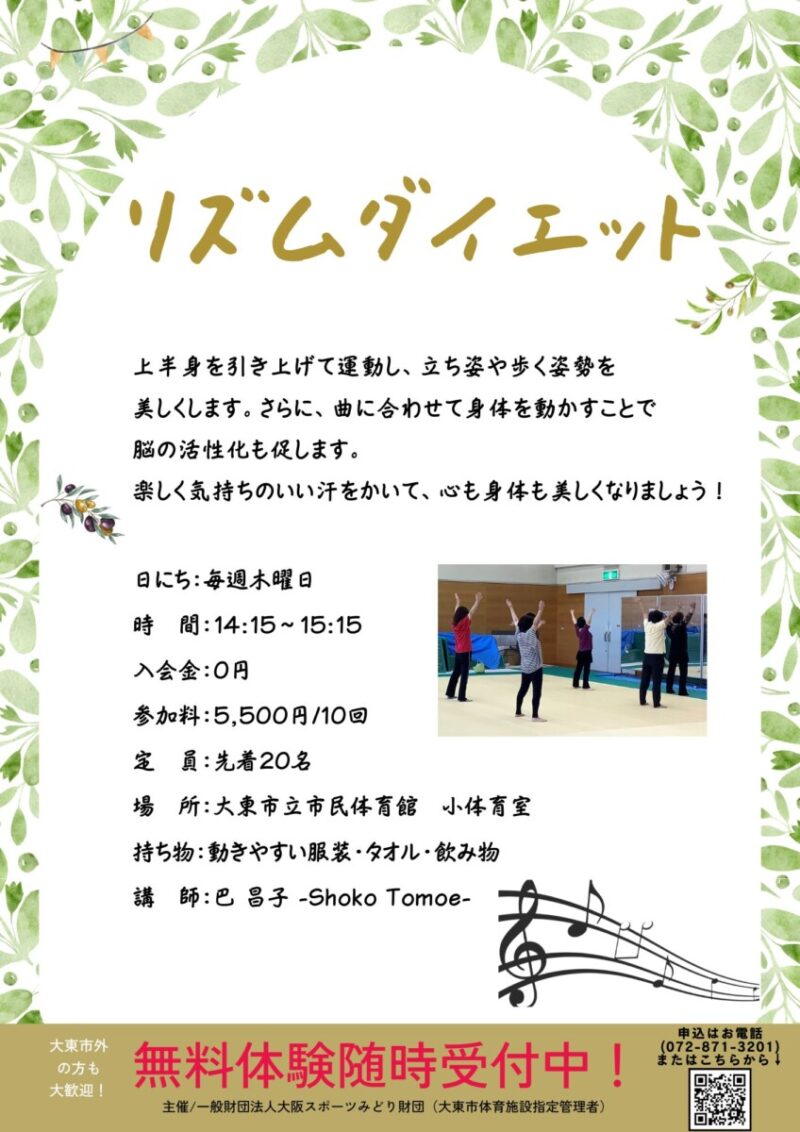 大東市立市民体育館では、健康的な身体づくりを楽しく!を目標に、さまざまな「教室」を行なっています。身体の軸を整えて美しい姿勢を目ざすボディメイクバレエ、楽しく気持ちのいい汗をかいて美しいダイエットを目ざすリズムダイエット、ゆったりと心と身体を整えるヨガ、幅広い年齢層に大人気のZUMBA、肩こりや腰痛のない身体を目ざすピラティス、子どもたちに人気のバトントワリングや年齢別のバレエ教室、ダンス・・・など、バリエーション豊かに、スポーツ教室20種類、文化教室2種類のプログラムを開講しています。
