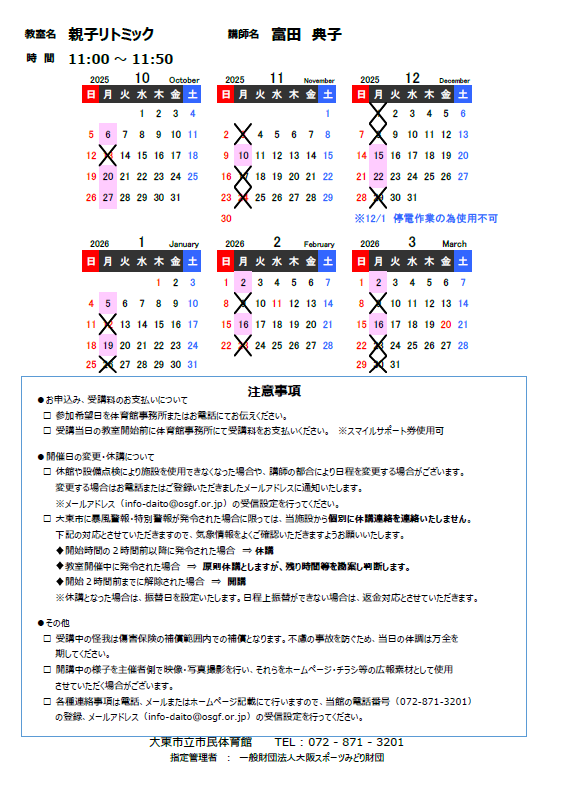 | 申し込み方法 | お申し込みは、事前予約制です。毎開講日前日までに市民体育館窓口・電話にてご予約ください。 ※1回毎の参加可能です(受講料は毎回参加時に受付にてお支払いください。) |