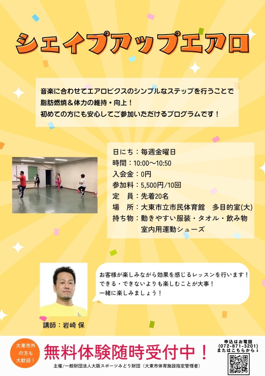 | 申し込み方法 | まずは市民体育館窓口・電話・申し込みフォームにて無料体験にお申込みください。(状況により新規申込を締め切っている場合がございます) |